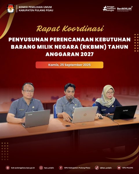 #TemanPemilih, KPU Kabupaten Pulang Pisau mengikuti Zoom Meeting Rapat Koordinasi Penyusunan Perencanaan Kebutuhan Barang Milik Negara (RKBMN) Tahun Anggaran 2027, yang dilaksanakan pada Kamis, 25 September 2025 pukul 10.00 WIB. Kegiatan ini menjadi bagian penting dalam mendukung tertib administrasi serta tata kelola Barang Milik Negara yang lebih transparan, akuntabel, dan terencana di lingkungan KPU. #KPUPulangPisau #KPUMelayani ....