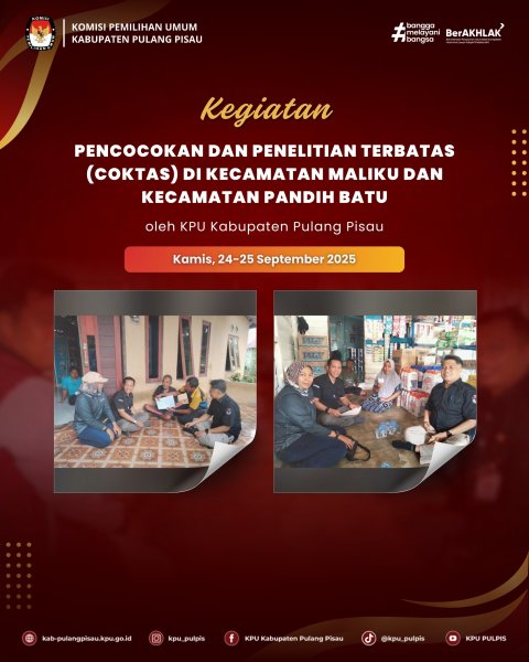 #TemanPemilih, KPU Kabupaten Pulang Pisau melaksanakan kegiatan Pencocokan dan Penelitian Terbatas (Coktas) di Kecamatan Maliku dan Kecamatan Pandih Batu. Kegiatan ini merupakan bagian dari upaya berkelanjutan untuk memastikan akurasi data pemilih serta menjaga kualitas daftar pemilih di Kabupaten Pulang Pisau. #KPUPulangPisau #KPUMelayani ....
