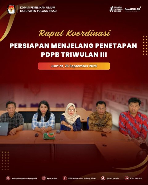 #TemanPemilih, KPU Kabupaten Pulang Pisau mengikuti Rapat Koordinasi Persiapan Menjelang Penetapan Pemuktahiran Data Pemilih Berkelanjutan (PDPB) Triwulan III, yang dilaksanakan pada Jumat, 26 September 2025 pukul 13.30 WIB secara daring melalui Zoom Meeting oleh KPU dengan dipimpin oleh Betty Epsilon Idroos selaku Komisioner KPU Divisi Data dan Informasi. Kegiatan ini diikuti oleh Divisi Perencanaan, Data dan Informasi Royan Hanapi, Plt. Sekretaris Cory Pramita Sartiana, Kasubbag Perencanaan, Data dan Informasi Annisa Wulandari bersama tim. Kegiatan ini merupakan bagian dari upaya KPU dalam memastikan proses pemutakhiran data pemilih berjalan dengan baik, akurat, dan berkelanjutan demi terwujudnya daftar pemilih yang lebih valid, transparan dan tersampaikan dengan baik kepada masyarakat. #KPUPulangPisau #KPUMelayani ....