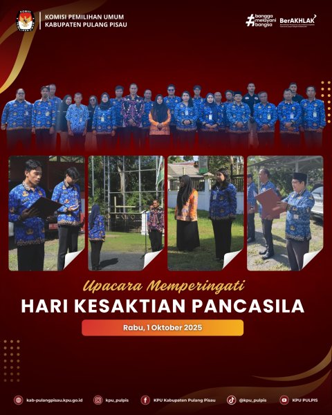 #TemanPemilih, KPU Kabupaten Pulang Pisau melaksanakan Upacara Peringatan Hari Kesaktian Pancasila, Rabu, 1 Oktober 2025 dengan tema “Pancasila Perekat Bangsa Menuju Indonesia Raya”. Bertindak sebagai Inspektur Upacara yaitu M. Zainurrohman (Anggota KPU Kabupaten Pulang Pisau), serta Komandan Upacara yaitu Oktari Purnamasari. Upacara ini menjadi wujud penghormatan dan penghayatan terhadap nilai-nilai Pancasila sebagai dasar dan ideologi bangsa yang senantiasa mempersatukan Indonesia. #KPUPulangPisau #KPUMelayani ....