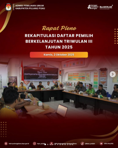#TemanPemilih, KPU Kabupaten Pulang Pisau melaksanakan Rapat Pleno Rekapitulasi Pemutakhiran Data Pemilih Berkelanjutan (PDPB) Triwulan III Tahun 2025, pada Rabu, 2 Oktober 2025. Kegiatan ini dipimpin oleh Ketua, Anggota, serta Plt. Sekretaris KPU Kabupaten Pulang Pisau, dan dihadiri pula oleh unsur stakeholder terkait, yaitu: 1. Kodim 1011/KLK 2. Polres Pulang Pisau 3. Disdukcapil Kabupaten Pulang Pisau 4. Korwil BIN Pulang Pisau 5. Kesbangpol Kabupaten Pulang Pisau 6. Bawaslu Kabupaten Pulang Pisau Rapat pleno ini menjadi bagian penting dalam memberikan informasi kepada masyarakat tentang hasil kerja KPU Kabupaten Pulang Pisau menjaga akurasi, validitas, dan keberlanjutan daftar pemilih, sehingga hak pilih masyarakat dapat terjamin pada setiap proses demokrasi. Mari bersama-sama mendukung terciptanya daftar pemilih yang berkualitas sebagai pondasi Pemilu dan Pilkada yang lebih baik, berintegritas, serta berdaulat. #KPUPulangPisau #KPUMelayani ....