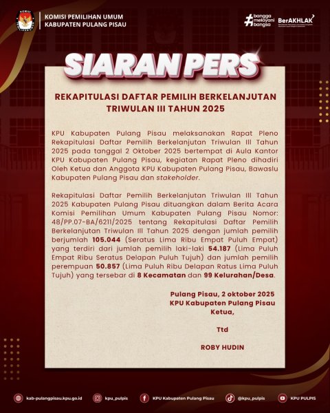 #TemanPemilih, Berikut adalah informasi grafik dan Pers Rilis hasil Rapat Pleno Rekapitulasi Daftar Pemilih Berkelanjutan Triwulan III Tahun 2025 Berdasarkan hasil pleno, jumlah Daftar Pemilih Berkelanjutan Triwulan III Tahun 2025 tercatat sebanyak 105.044 pemilih, terdiri dari 54.187 laki-laki dan 50.857 perempuan yang tersebar di 8 kecamatan dan 99 desa/kelurahan. #KPUPulangPisau #KPUMelayani ....