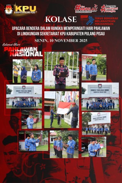 #TemanPemilih, Dalam rangka memperingati Hari Pahlawan Nasional Tahun 2025, KPU Kabupaten Pulang Pisau melaksanakan Upacara Bendera yang berlangsung khidmat di halaman kantor KPU Kabupaten Pulang Pisau pada Senin, 10 November 2025 pukul 08.00 WIB. Upacara dipimpin oleh Bapak Rakhmadi Nor, selaku Kasubbag Keuangan, Umum, dan Logistik (KUL), serta Pembina Apel oleh Bapak M. Zainurrohman, Anggota KPU Kabupaten Pulang Pisau. Dengan mengusung tema “Pahlawanku Teladanku, Terus Bergerak, Melanjutkan Perjuangan”, kegiatan ini menjadi wujud penghormatan atas jasa para pahlawan serta semangat untuk terus melanjutkan perjuangan dalam membangun bangsa. #KPUMelayani #KPUPulangPisau ....