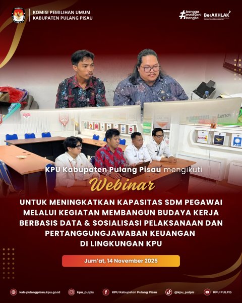 KPU KABUPATEN PULANG PISAU MENGIKUTI WEBINAR TERKAIT KEGIATAN MEMBANGUN BUDAYA KERJA BERBASIS DATA DAN SOSIALISASI PELAKSANAAN PERTANGGUNGJAWABAN KEUANGAN DI LINGKUNGAN KPU