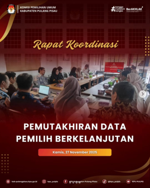 KPU Kabupaten Pulang Pisau melaksanakan Rapat Koordinasi Pemutakhiran Data Pemilih Berkelanjutan (PDPB) pada 27 November 2025. Kegiatan ini menjadi bagian dari upaya berkelanjutan untuk menjaga akurasi dan kualitas data pemilih di wilayah Kabupaten Pulang Pisau dengan berkoordinasi dengan seluruh pemangku kepentingan untuk mendapatkan masukan dan tanggapan. Rapat koordinasi ini turut dihadiri oleh seluruh stakeholder terkait, yang berperan penting dalam mendukung kelancaran proses pemutakhiran data pemilih. Kehadiran berbagai pihak ini memperkuat kolaborasi dalam mewujudkan data yang valid dan terpercaya. Melalui kegiatan ini, KPU Kabupaten Pulang Pisau berharap sinergi antarinstansi dapat terus ditingkatkan, sehingga pengelolaan data pemilih dapat berjalan semakin efektif, terstruktur, dan berkesinambungan. #KPUMelayani #KPUPulangPisau ....