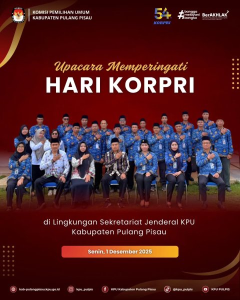 #TemanPemilih, KPU Kabupaten Pulang Pisau melaksanakan Upacara Memperingati Hari KORPRI pada Senin, 1 Desember 2025 di lingkungan Sekretariat Jenderal KPU Kabupaten Pulang Pisau. Dalam kegiatan tersebut, Cory Pramita Sartiana selaku Plt. Sekretaris bertindak sebagai Pembina Upacara, dan Annisa Wulandari selaku Kepala Subbagian Perencanaan, Data, dan Informasi bertindak sebagai Pemimpin Upacara. Pelaksanaan upacara berlangsung tertib dan penuh khidmat. Peringatan Hari KORPRI ini menjadi momentum untuk memperkuat integritas, profesionalitas, dan semangat pengabdian ASN dalam memberikan pelayanan terbaik kepada masyarakat. #KPUMelayani #KPUPulangPisau ....