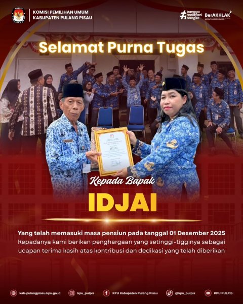 #TemanPemilih, KPU Kabupaten Pulang Pisau menyampaikan ucapan Selamat Purna Tugas kepada Bapak Idjai yang telah memasuki masa pensiun pada tanggal 01 Desember 2025. Terima kasih atas pengabdian, tenaga, dan pikiran yang telah diberikan selama bertugas. Semoga seluruh kontribusi, dedikasi, serta ketulusan beliau menjadi amal kebaikan dan membawa keberkahan bagi kita semua. “Selamat menikmati waktu bersama keluarga tercinta. Semoga senantiasa diberkahi oleh Tuhan Yang Maha Kuasa.” #KPUMelayani #KPUPulangPisau ....