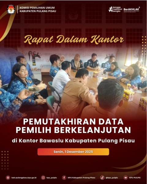 #TemanPemilih, KPU Kabupaten Pulang Pisau menghadiri Rapat Dalam Kantor (RDK) yang dilaksanakan oleh Bawaslu Kabupaten Pulang Pisau pada Senin, 1 Desember 2025, bertempat di Ruang Rapat Kantor Bawaslu Kabupaten Pulang Pisau. Kegiatan ini juga di hadiri oleh Perwakilan dari Disdukcapil dan Perwakilan dari Kesbangpol Kabupaten Pulang Pisau untuk membahas terkait Pemutakhiran Data Pemilih Berkelanjutan (PDPB) sebagai bagian dari sinergi antar lembaga penyelenggara pemilu dalam menjaga validitas data pemilih di wilayah Kabupaten Pulang Pisau. Melalui kegiatan ini, KPU dan Bawaslu berkomitmen untuk terus memperkuat koordinasi serta memastikan proses pembaruan data pemilih berjalan akurat, transparan, dan berkelanjutan. #KPUKabupatenPulangPisau #KPUMelayani ....