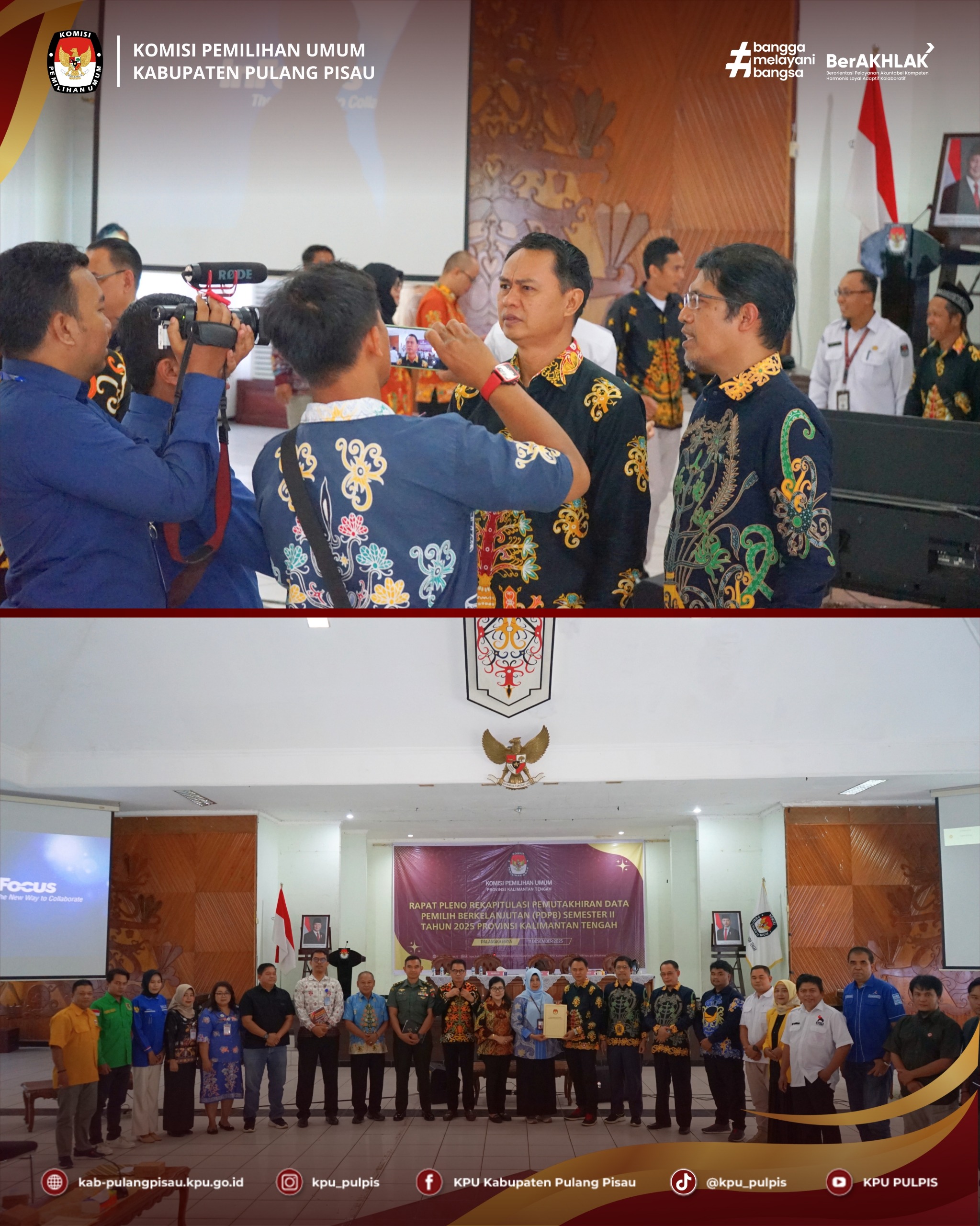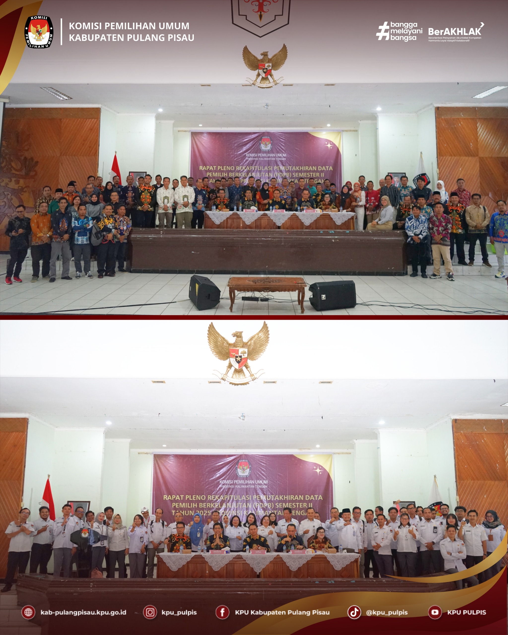 Kemudian, pada Kamis, 11 Desember 2025, KPU Kabupaten Pulang Pisau turut mengikuti Rapat Pleno Rekapitulasi PDPB Semester II Tahun 2025 yang dilaksanakan di Aula Palampang Tarung Kantor Wali Kota Palangka Raya. Peserta dari KPU Pulang Pisau meliputi Ketua KPU Kabupaten Pulang Pisau, Roby Hudin; para Anggota Eko Susanto, M. Zainurrohman, Royan Hanapi, dan Vivi Herlina; Plt. Sekretaris Cory Pramita Sartiana; Kasubbag Perencanaan, Data, dan Informasi Annisa Wulandari; serta Operator SIDALIH Rifky Alfiannur.