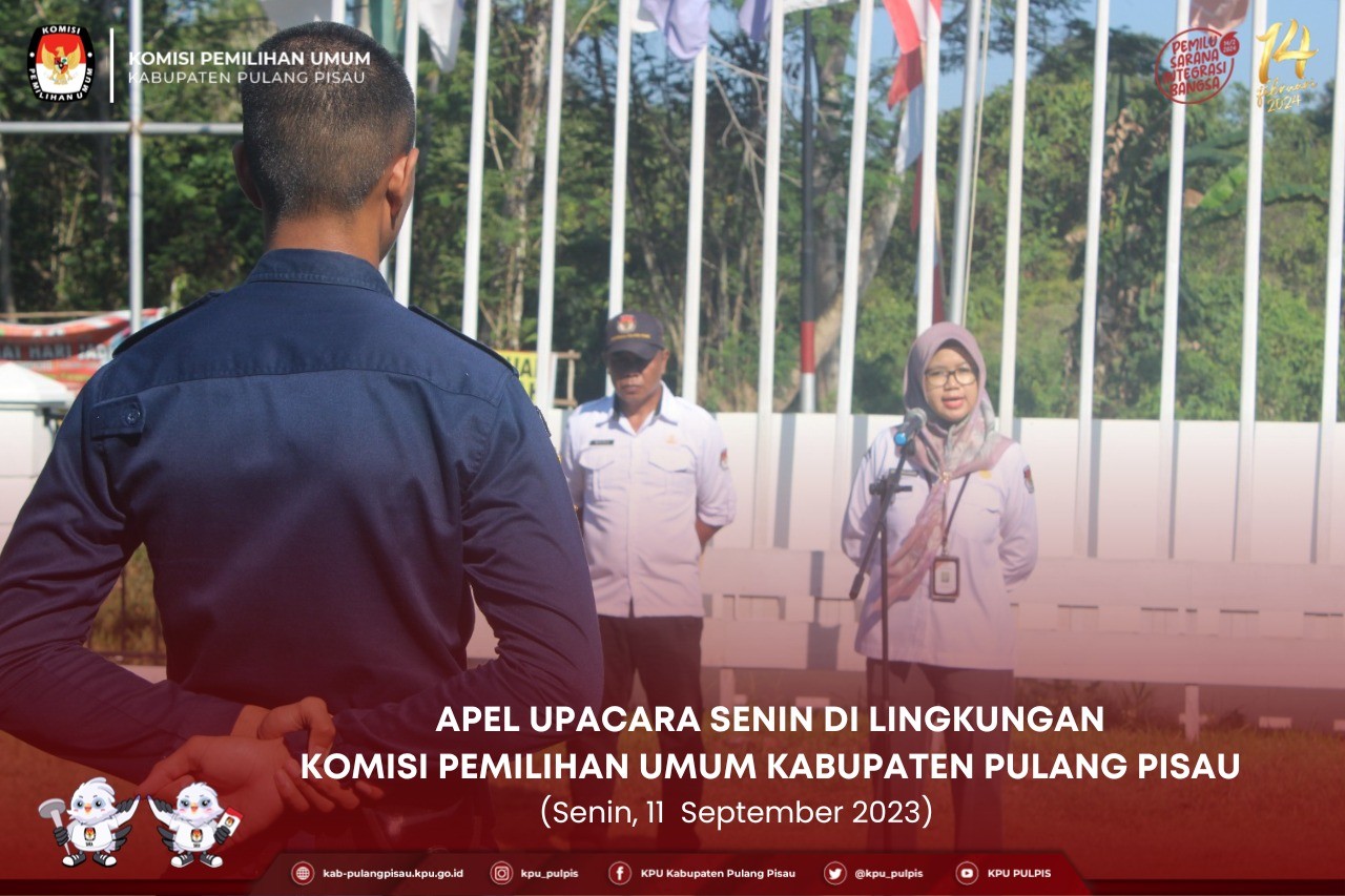 Bahwa sebagai Penyelenggara Pemilu yang selalu siap melaksanakan Tahapan Pemilihan Umum, KPU Kabupaten Pulang Pisau memulai hari kerja dengan melaksanakan giat Upacara sebagai bentuk kesiapan. Dalam kesempatan ini, Ibu Annisa Wulandari selaku Inspektur Upacara menyampaikan agar tetap menjaga kesehatan dalam melaksanakan agenda tahapan yaitu persiapan penetapan Daftar Calon Tetap, persiapan Kampanye dan Dana Kampanye serta persiapan dalam menyusun SKP Triwulan III pada bulan September tahun 2023 bagi seluruh PNS dilingkungan Sekretariat KPU Kabupaten Pulang Pisau.