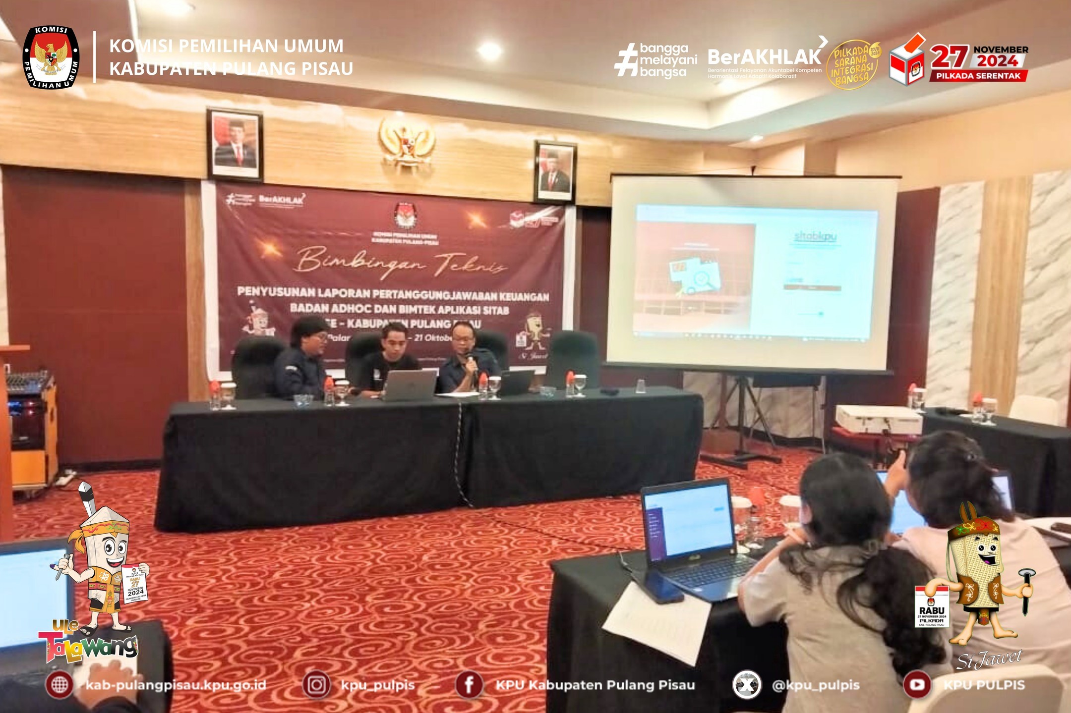 KPU Kabupaten Pulang Pisau gelar kegiatan Bimbingan Teknis Penyusunan Laporan Pertanggungjawaban Keuangan Badan Adhoc dan Bimtek Aplikasi Sitab se-Kabupaten Pulang Pisau. Di Aquarius Boutique Hotel Palangka Raya (19 s.d 21 Oktober 2024).