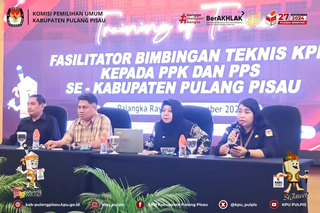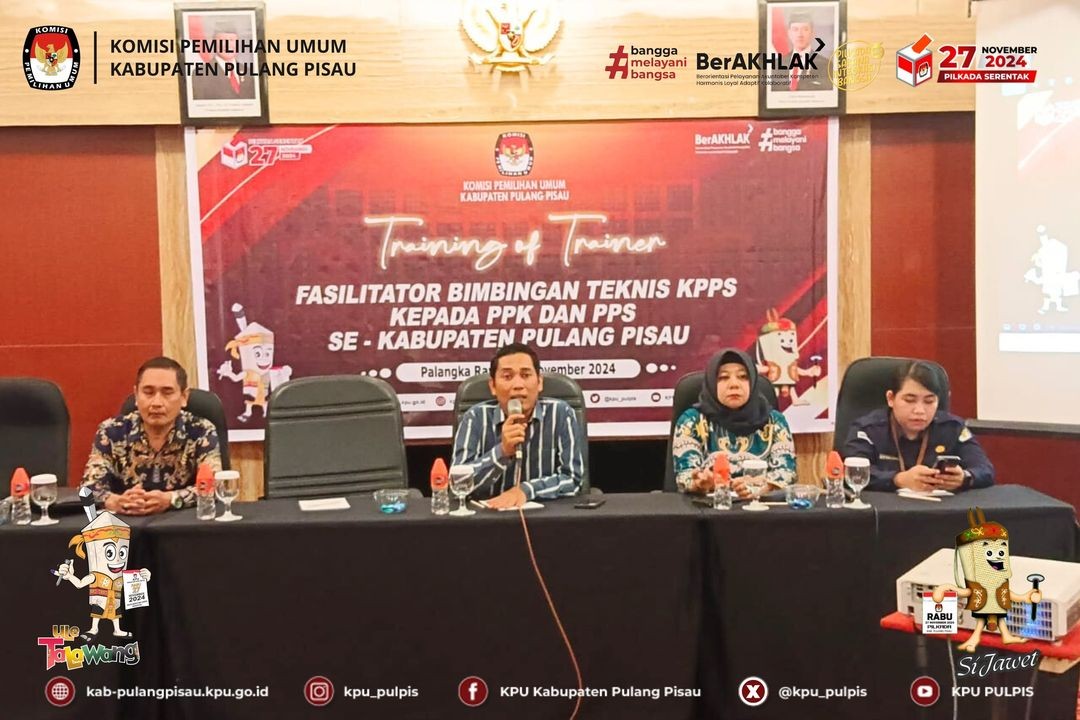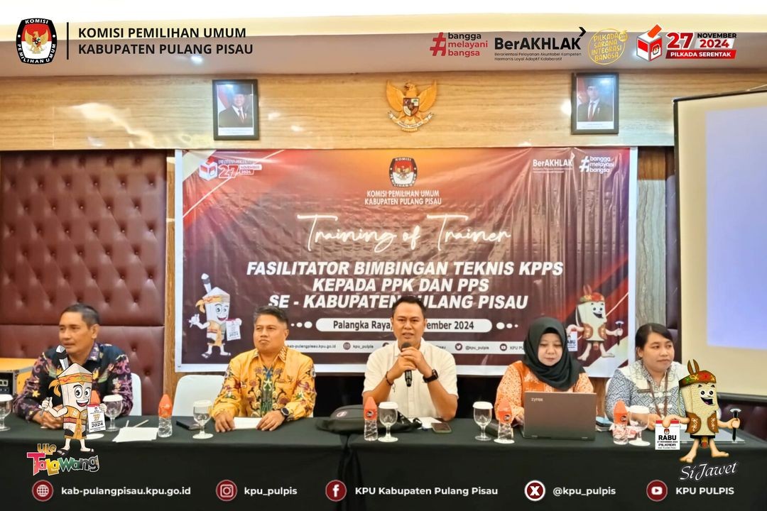 KPU Kabupaten Pulang Pisau gelar kegiatan Training of Trainer Fasilitator Bimbingan Teknis KPPS kepada PPK dan PPS se-Kabupaten Pulang Pisau di Aquarius Boutique Hotel Palangka Raya, tanggal 01 s.d 03 November 2024.