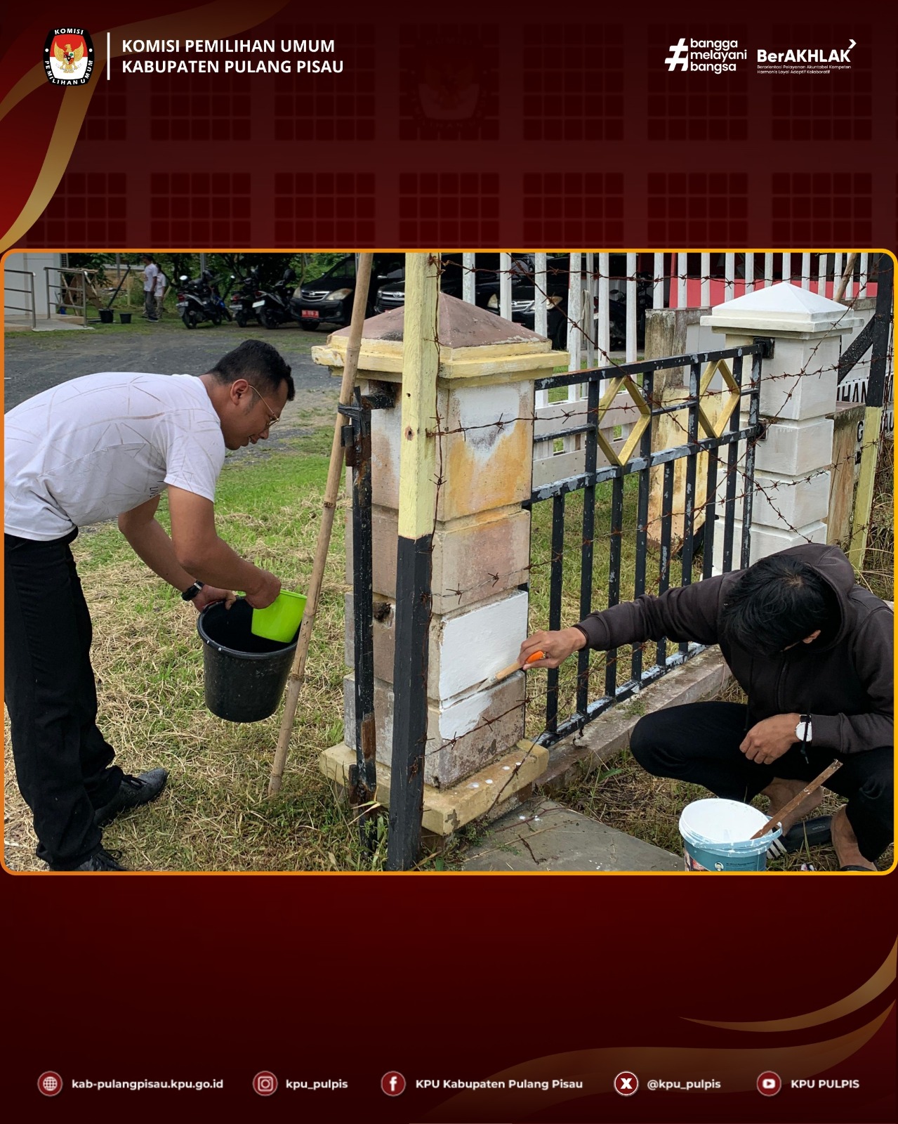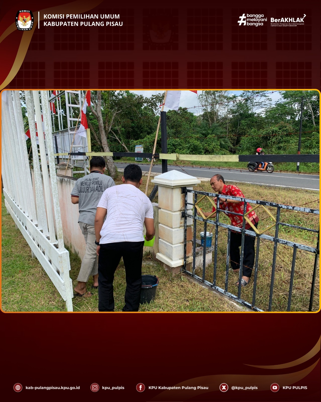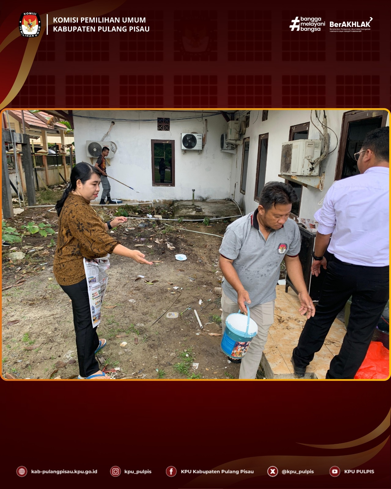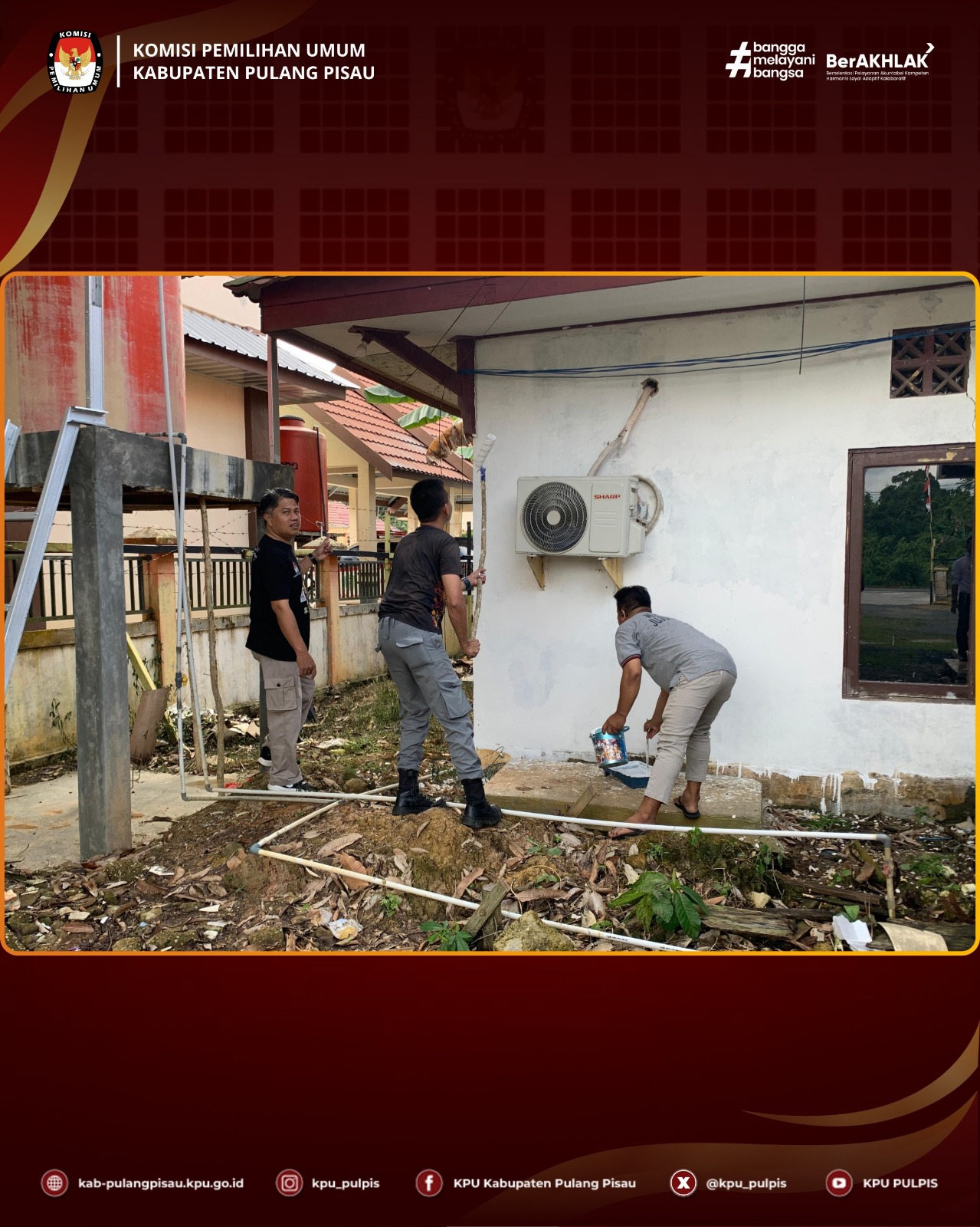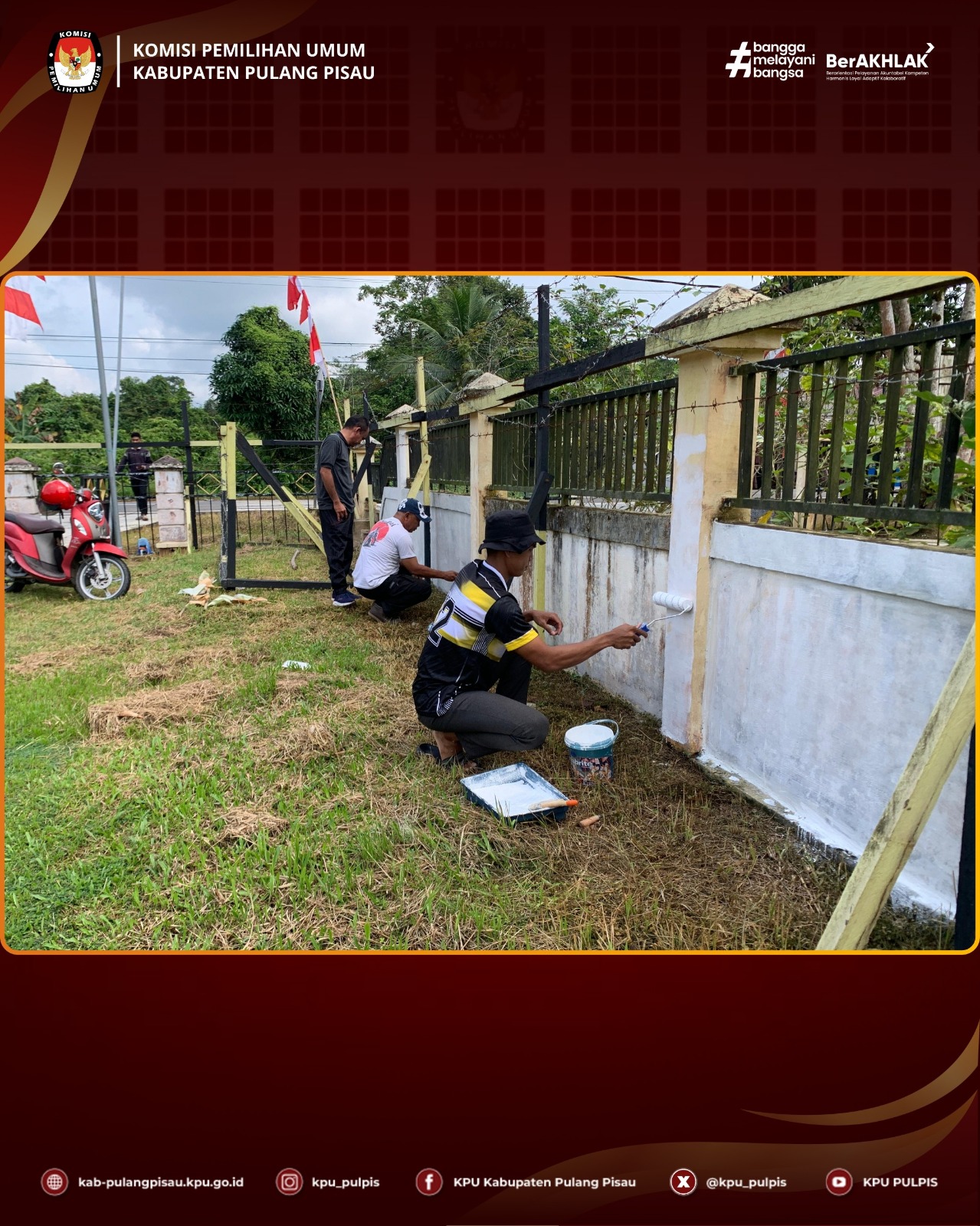 KPU Kabupaten Pulang Pisau melaksanakan kerja bakti kantor yang diikuti oleh seluruh pegawai, dengan kegiatan meliputi mengecat, menata kabel, dan membersihkan ruang kerja.
