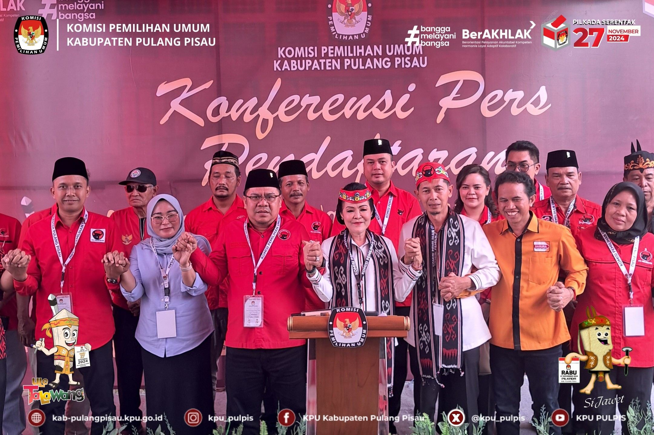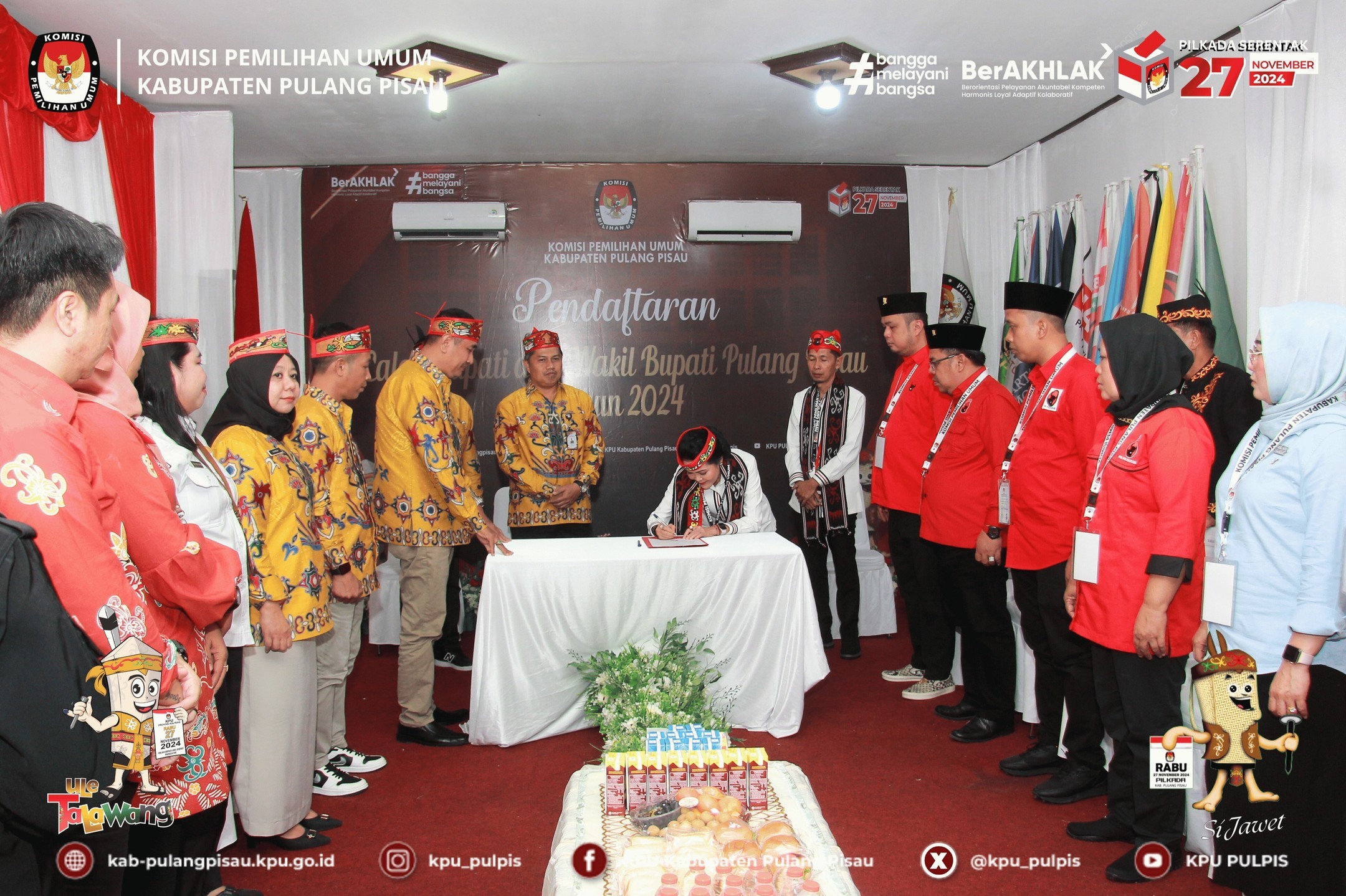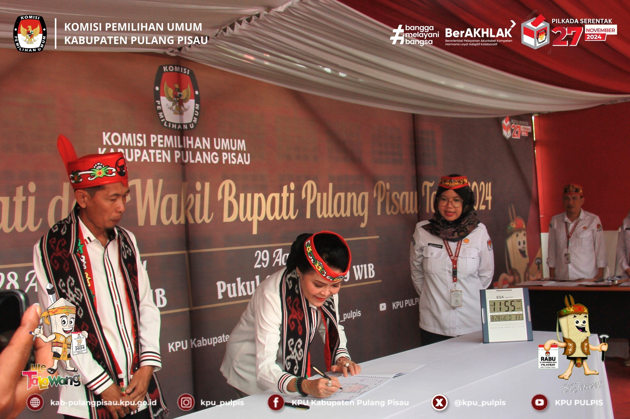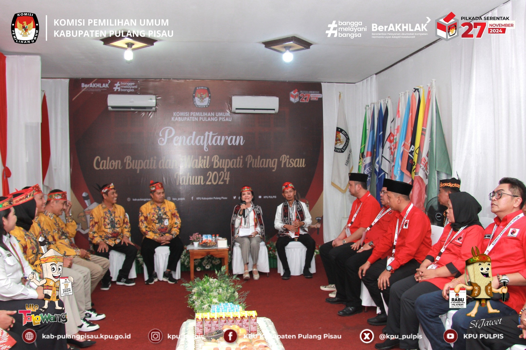 KPU Kabupaten Pulang Pisau menerima pendaftaran Pasangan Calon Pudjirustaty Narang - Joni hari ketiga Pendaftaran Calon Bupati dan Wakil Bupati Pulang Pisau Tahun 2024 pukul 11.55 WIB, Kamis (29/08/2024).