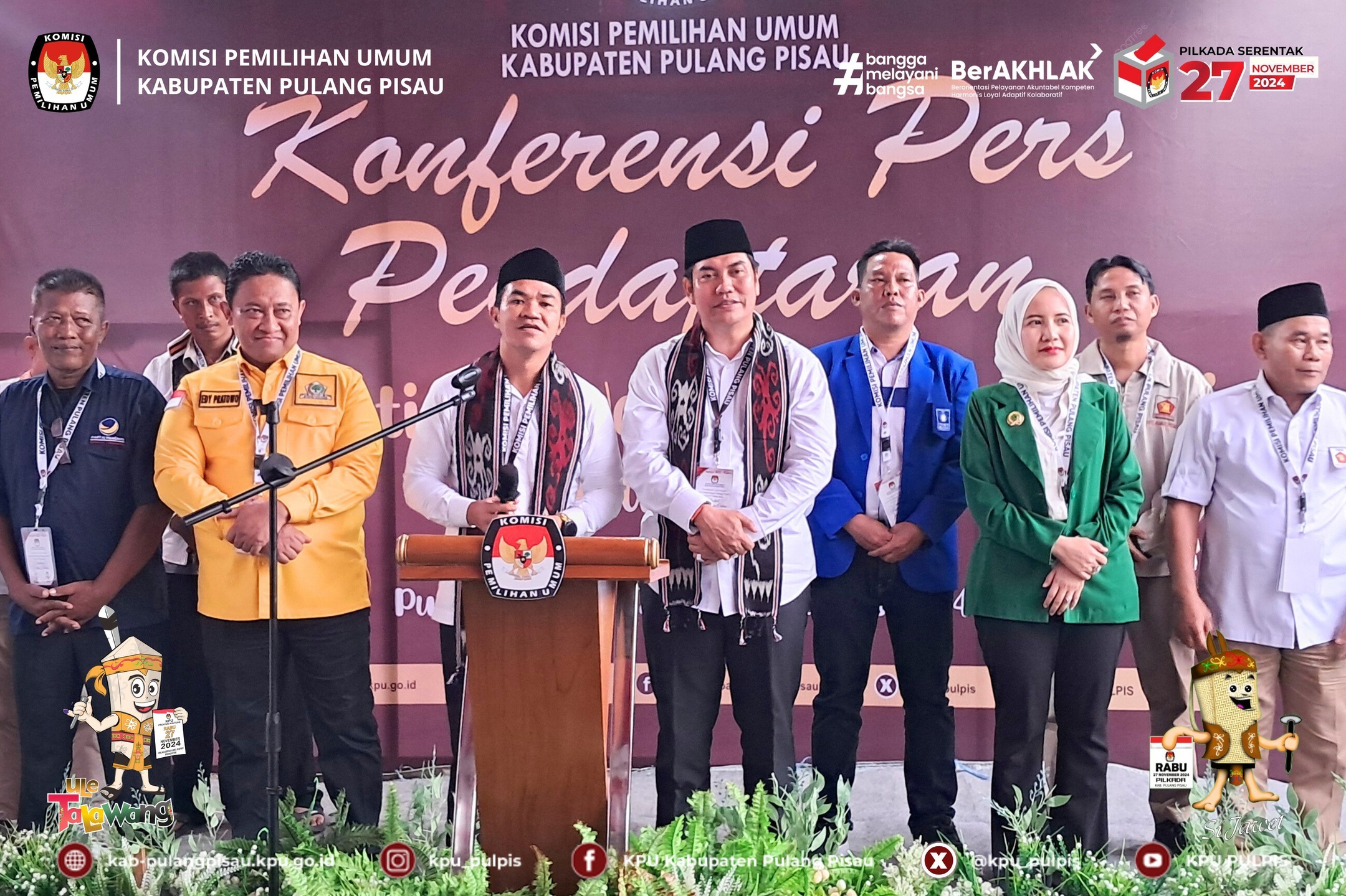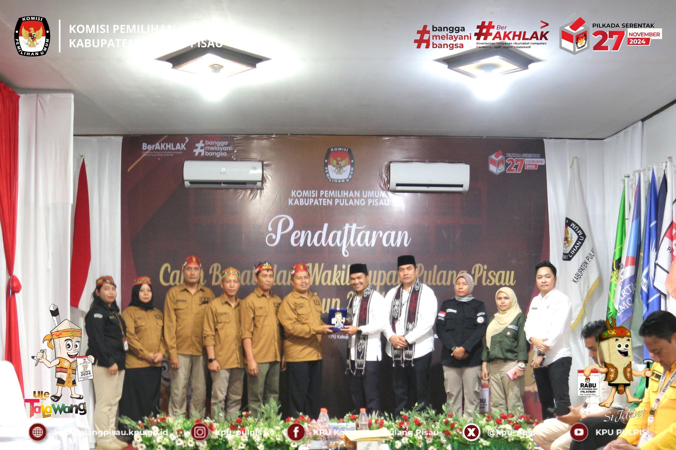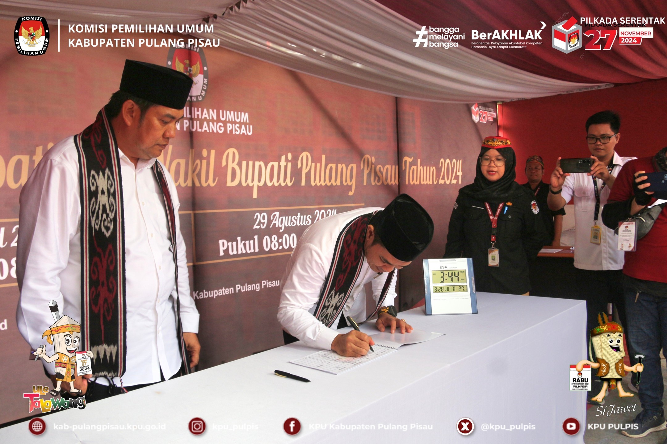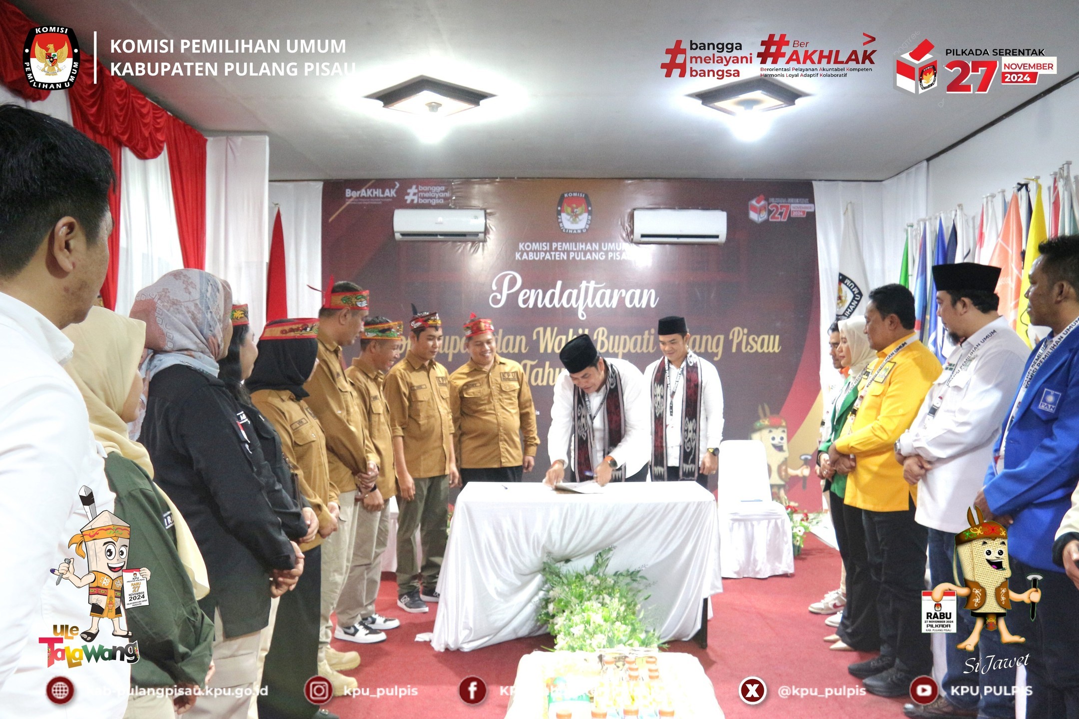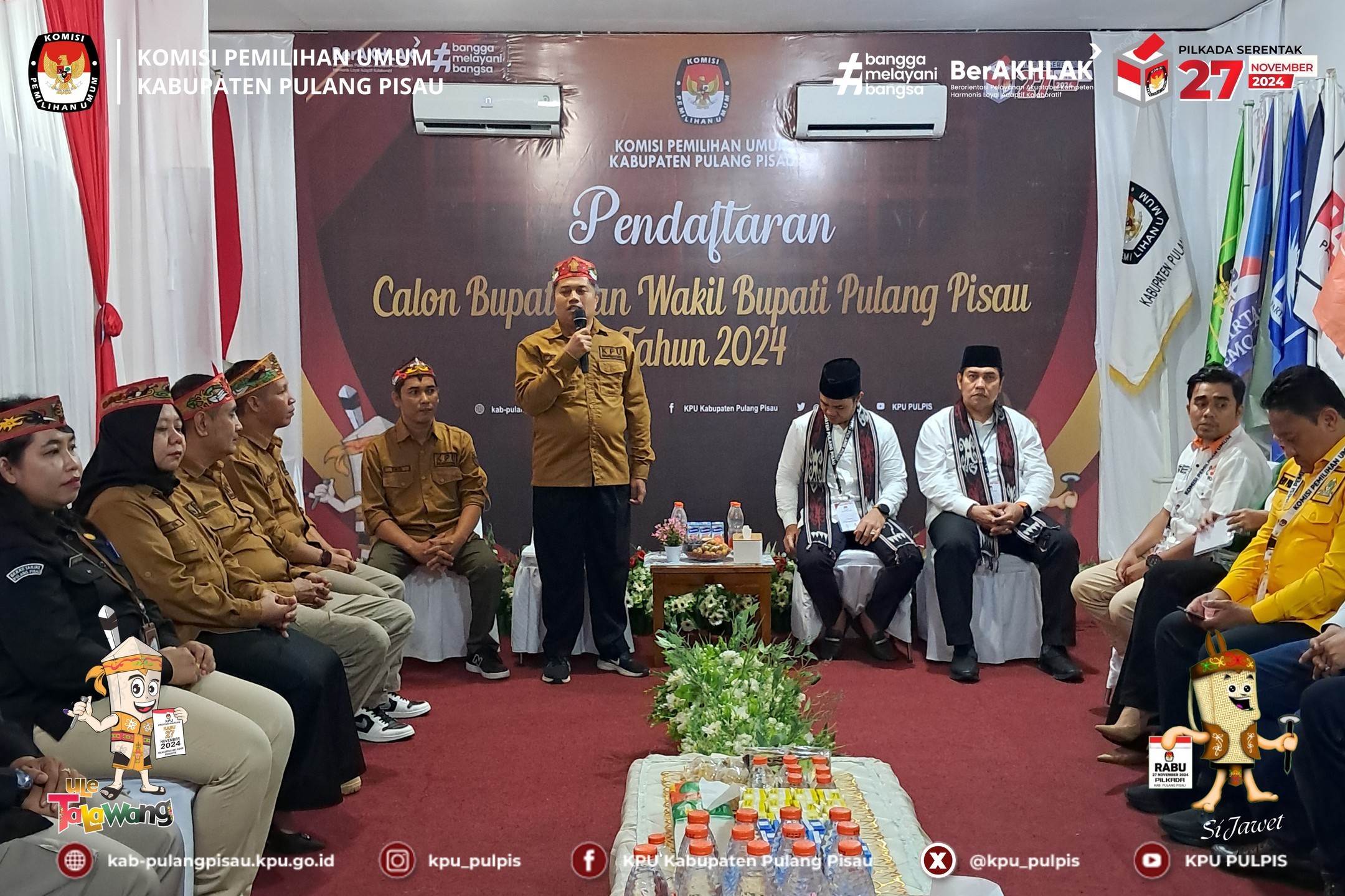 KPU Kabupaten Pulang Pisau menerima pendaftaran Pasangan Calon Ahmad Rifa'i - Ahmad Jayadikarta pada hari kedua Pendaftaran Calon Bupati dan Wakil Bupati Pulang Pisau Tahun 2024 pukul 15.44 WIB, Rabu (28/08/2024).