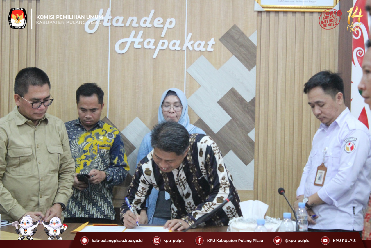 Ketua KPU Kabupaten Pulang Pisau Roby Hudin dan Sekretaris Daerah Kabupaten Pulang Pisau Tony Harisinta serta disaksikan oleh Pj. Bupati Pulang Pisau Hj. Nunu Andriani menandatangani Berita Acara Kesepakatan Bersama Pendanaan Pemilihan Bupati Dan Wakil Bupati Tahun 2024, bertempat di Kantor Bupati Pulang Pisau pada hari Jumat (13/10/2023).