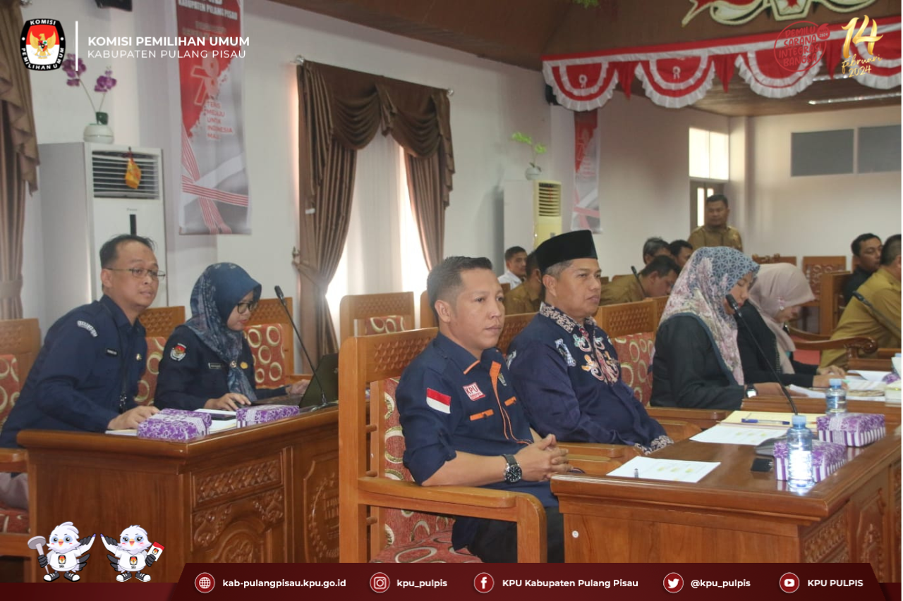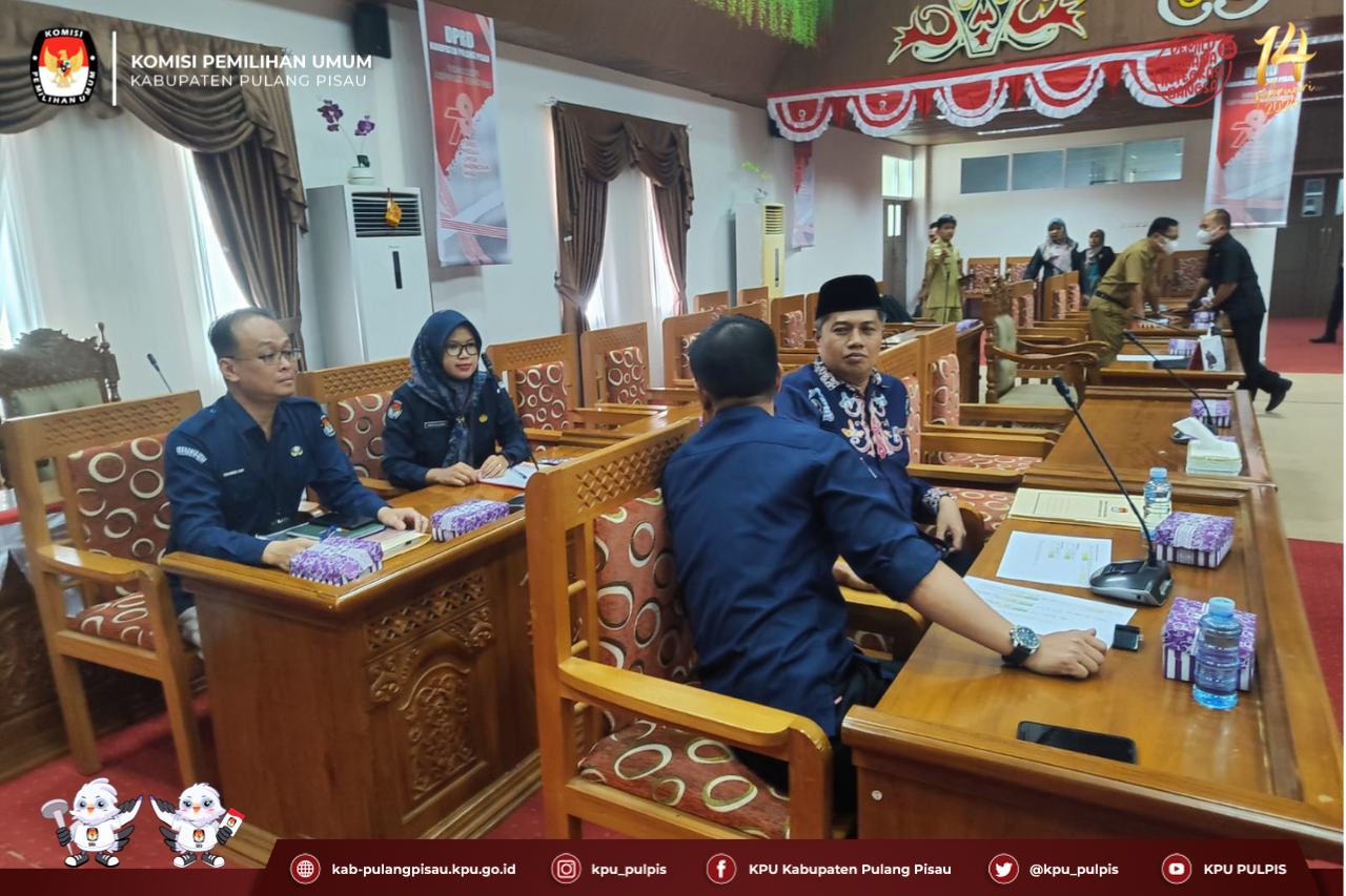Ketua KPU Kabupaten Pulang Pisau Roby Hudin dan Anggota Royan Hanapi didampingi Plt. Sekretaris Rakhmadi Nor dan Kassubag Perencanaan, Data dan Informasi Annisa Wulandari mengikuti Rapat Dengar Pendapat terkait Anggaran Pilkada Serentak Tahun 2024 dengan Komisi I DPRD Kabupaten Pulang Pisau pada Selasa 3 Oktober 2023 di Ruang Rapat Kantor DPRD Kabupaten Pulang Pisau.