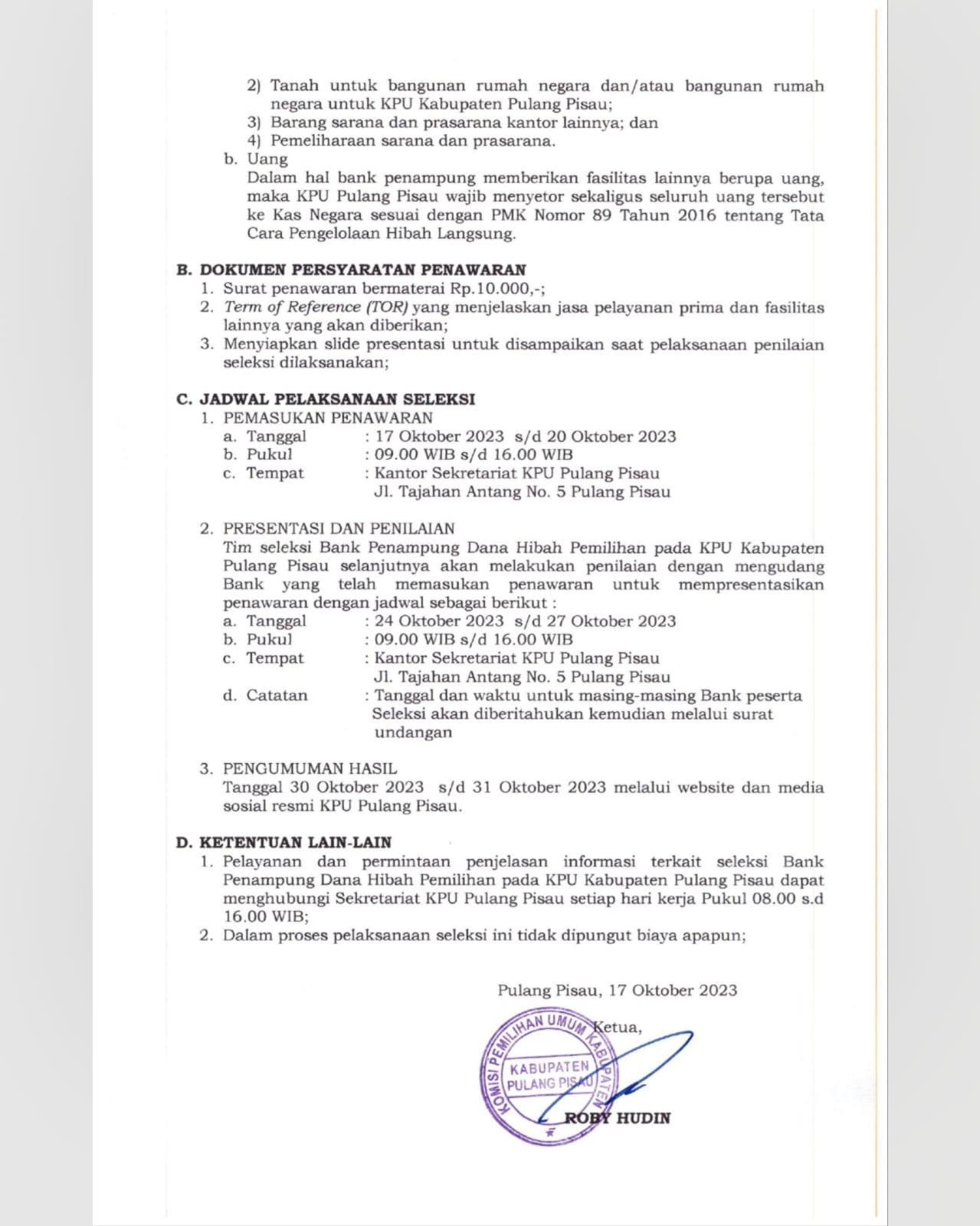 SELEKSI BANK PENAMPUNG DANA HIBAH PEMILIHAN BUPATI DAN WAKIL BUPATI PULANG PISAU TAHUN 2024 PADA KOMISI PEMILIHAN UMUM KABUPATEN PULANG PISAU