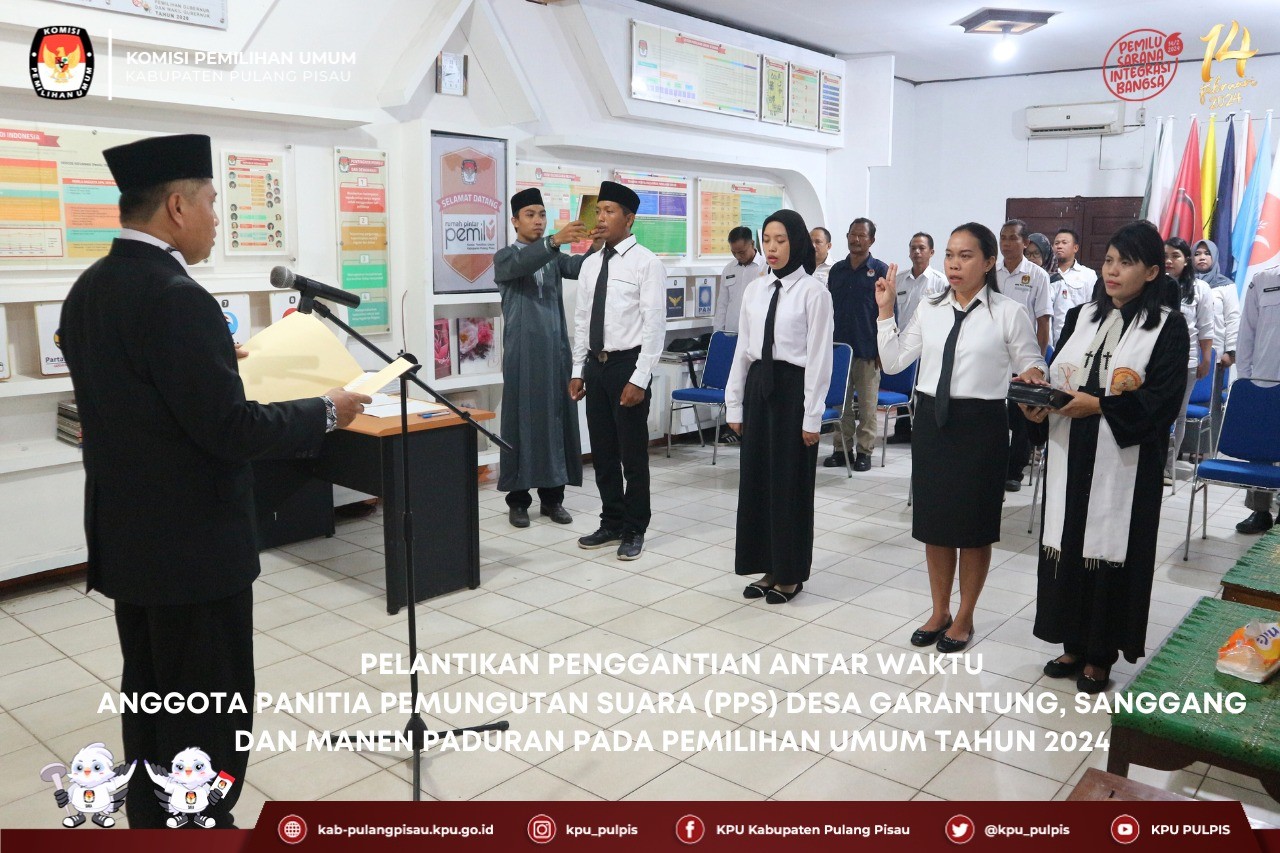 Pengambilan Sumpah dan Janji PAW Anggota PPS Desa Garantung, PAW Anggota PPS Desa Sanggang dan PAW Anggota PPS Desa Manen Paduran oleh Ketua Komisi Pemilihan Umum Kabupaten Pulang Pisau, Roby Hudin. Dalam sambutannya beliau menyampaikan supaya Anggota PPS yang dilantik bisa menyesuaikan ritme pekerjaan sesuai tahapan yang berjalan mengingat 103 hari lagi kita akan melaksanakan pemungutan suara. "Menjadi penyelenggara Pemilu harus berpedoman pada Sumpah dan Pakta Integritas yang sudah dinyatakan dihadapan sesama manusia dan Tuhan Yang Maha Esa. Penyelenggara Pemilu harus bekerja taat asas, menjaga integritas dan harus menjaga soliditas dalam tim kerja" tegasnya.