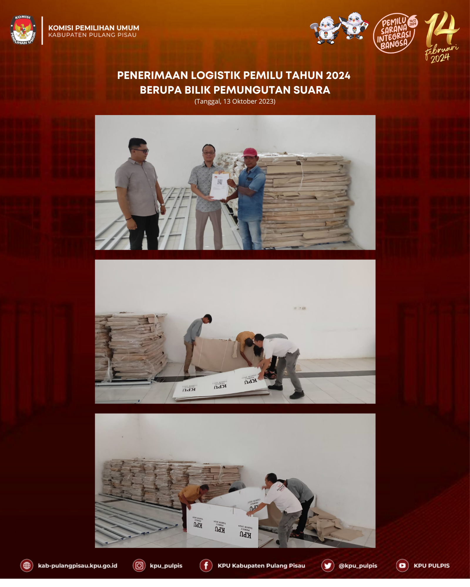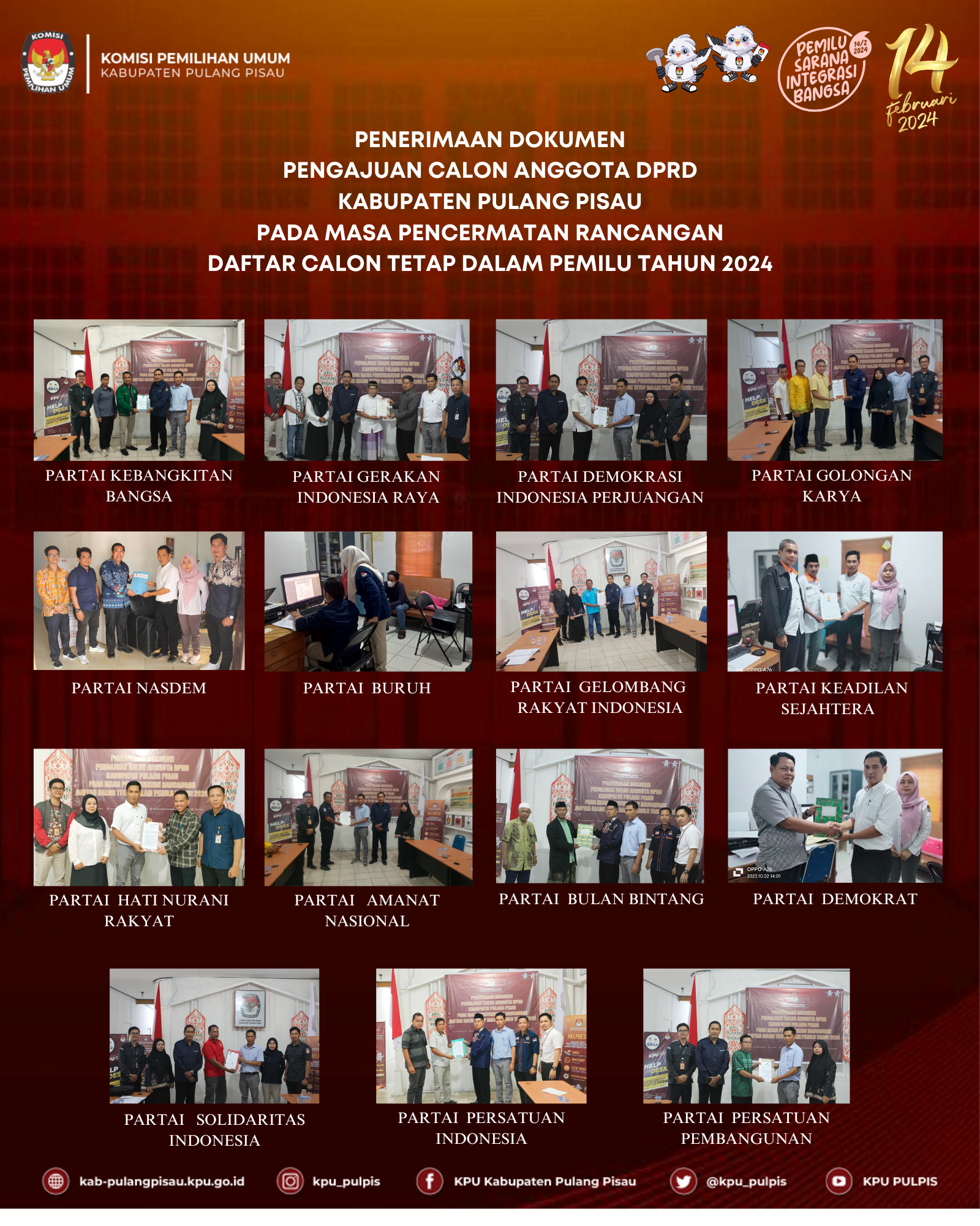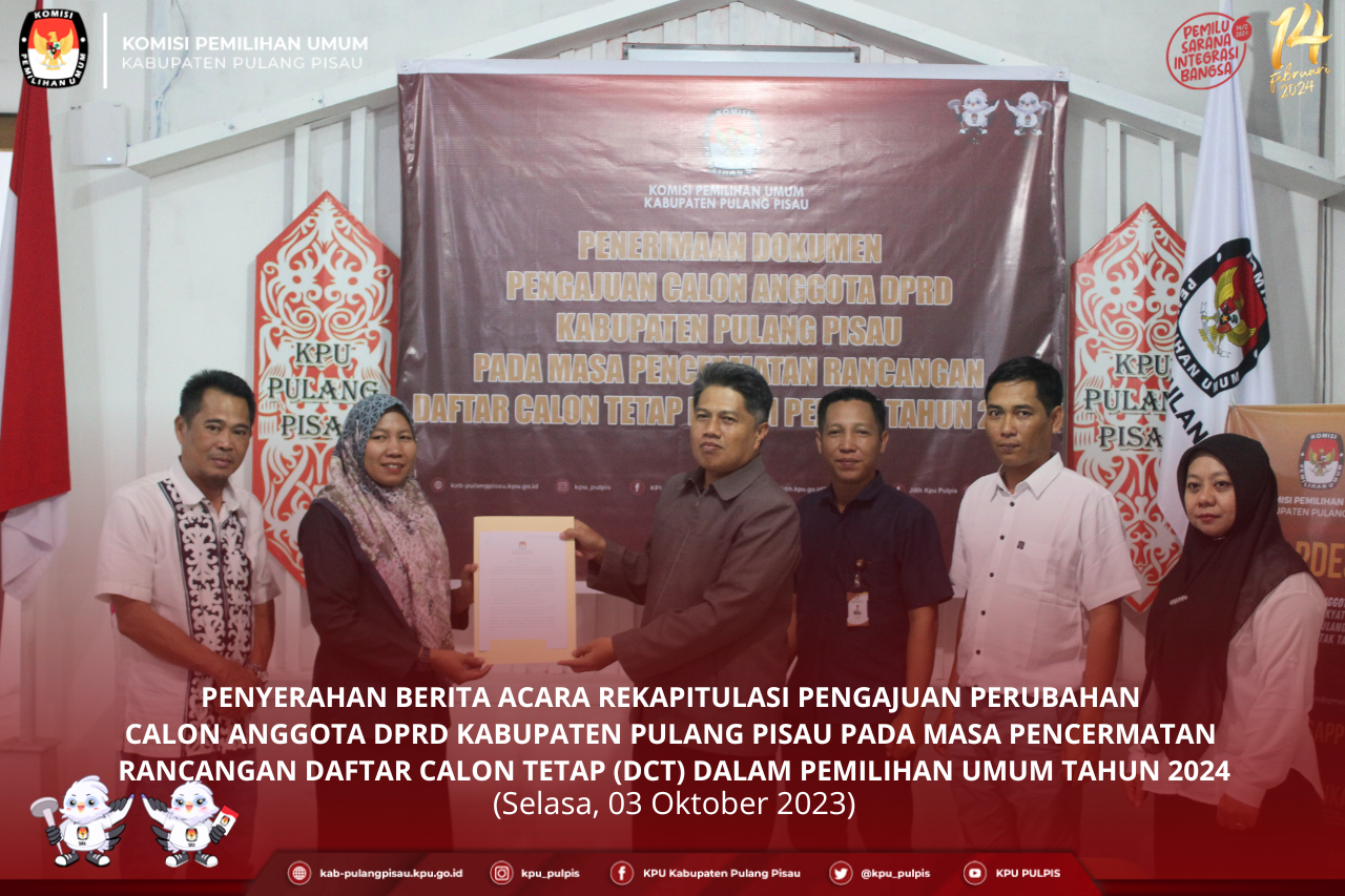KPU Kabupaten Pulang Pisau telah melaksanakan kegiatan Penerimaan Dokumen Pengajuan Calon Anggota DPRD Kabupaten Pulang Pisau pada masa Pencermatan Daftar Calon Tetap (DCT) yang dimulai pada tanggal 24 September - 03 Oktober 2023.