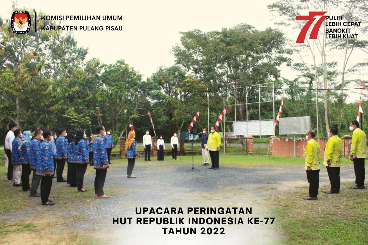 Pulang Pisau, 17 Agustus 2022 - Komisi Pemilihan Umum Kabupaten Pulang Pisau melaksanakan Upacara Peringatan Hari Ulang Tahun Kemerdekaan Republik Indonesia ke 77 di halaman kantor pada pukul 07.00 WIB dilaksanakan penuh khikmad dengan Instruktur Upacara Bapak Ahmad Najarudin selaku Plh. Ketua. Dalam amanat Ketua KPU Republik Indonesia yang dibacakan oleh Instruktur Upacara mengingatkan bahwa HUT Kemerdekaan Republik Indonesia kali ini disambut dengan rangkaian pelaksanaan tahapan Pemilu yang dimulai sejak 14 Juni 2022. Oleh sebab itu seluruh insan KPU disetiap tingkatan agar dalam melaksanakan tugas dan tanggungjawabnya harus mandiri, jujur, adil, profesional, dan proporsional serta menjaga integritas selama 24 (dua puluh empat) jam.