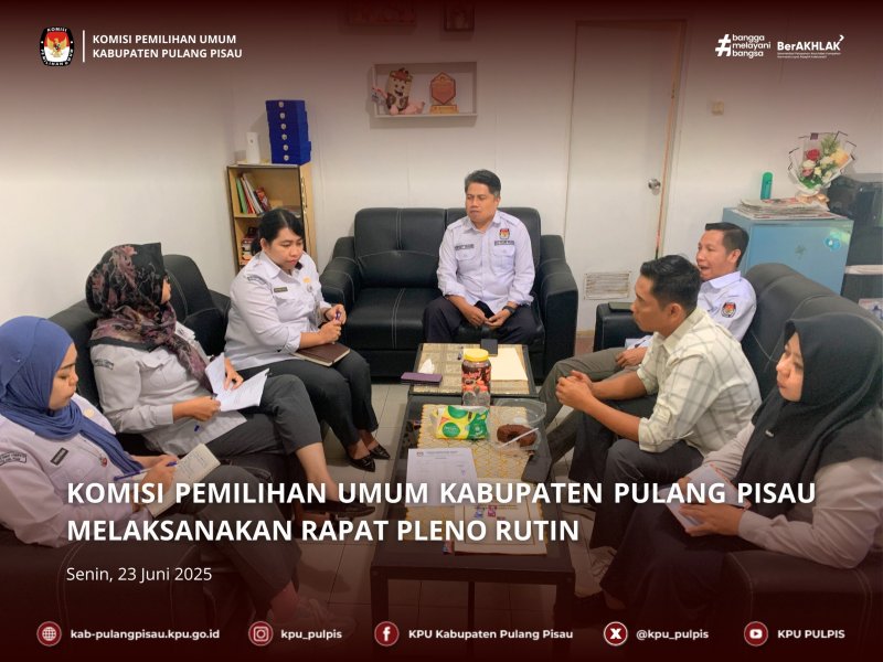 KPU Kabupaten Pulang Pisau melaksanakan Rapat Pleno Rutin mingguan yang digelar di ruang Ketua KPU Kabupaten Pulang Pisau pada Senin, 23 Juni 2025. Rapat ini merupakan agenda reguler yang bertujuan untuk membahas perkembangan kegiatan kelembagaan serta mengevaluasi pelaksanaan program kerja.
