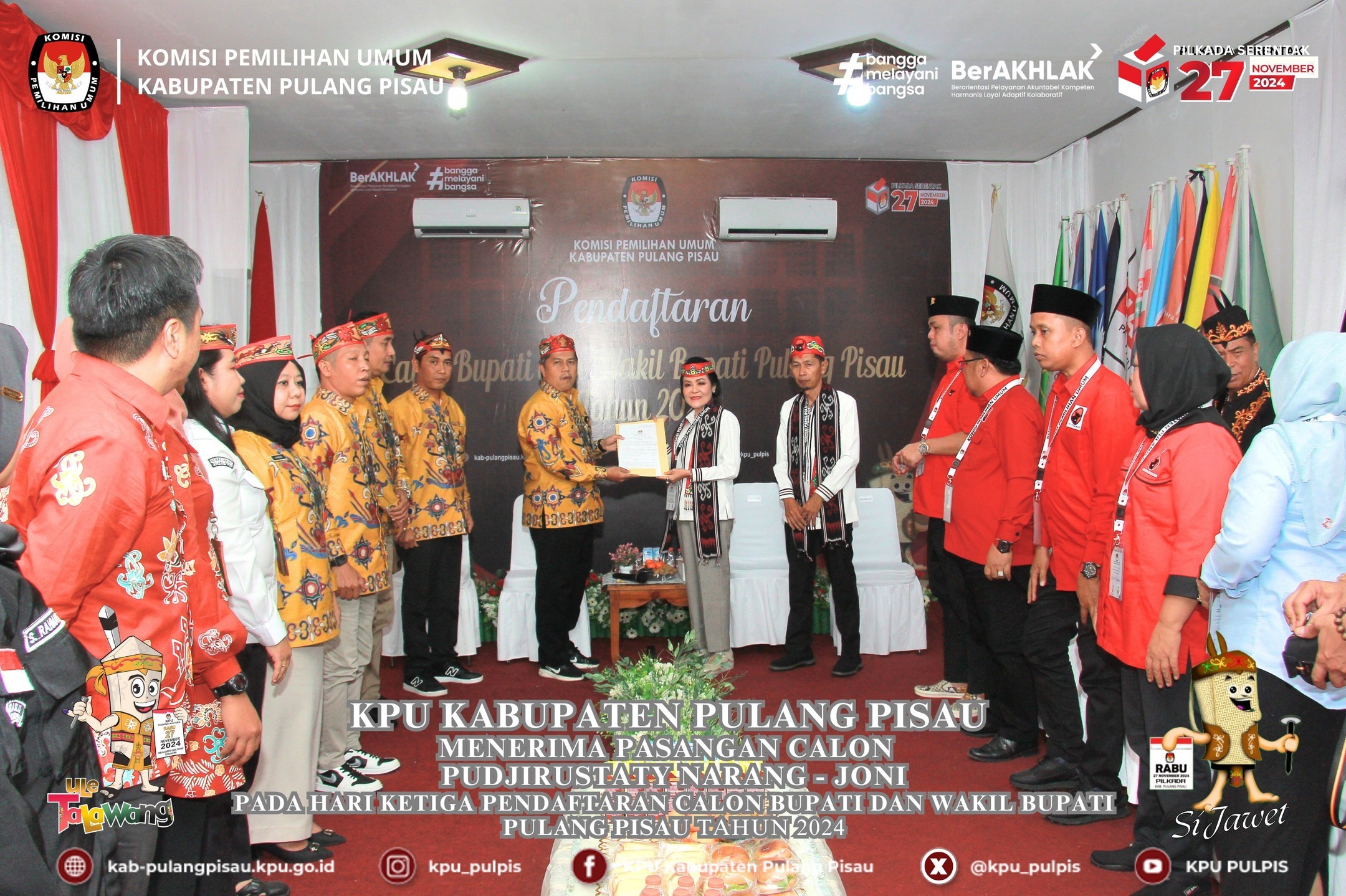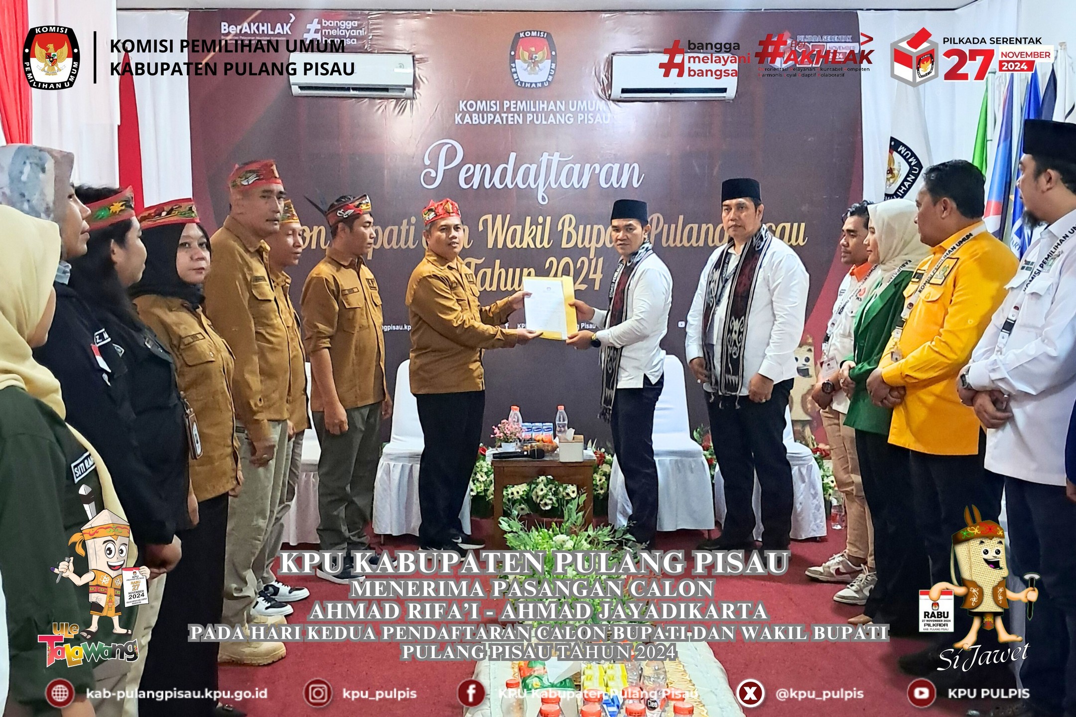 KPU Kabupaten Pulang Pisau menerima pendaftaran Pasangan Calon Ahmad Rifa'i - Ahmad Jayadikarta pada hari kedua Pendaftaran Calon Bupati dan Wakil Bupati Pulang Pisau Tahun 2024 pukul 15.44 WIB, Rabu (28/08/2024).