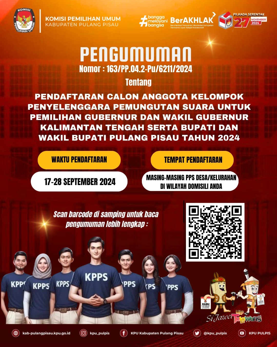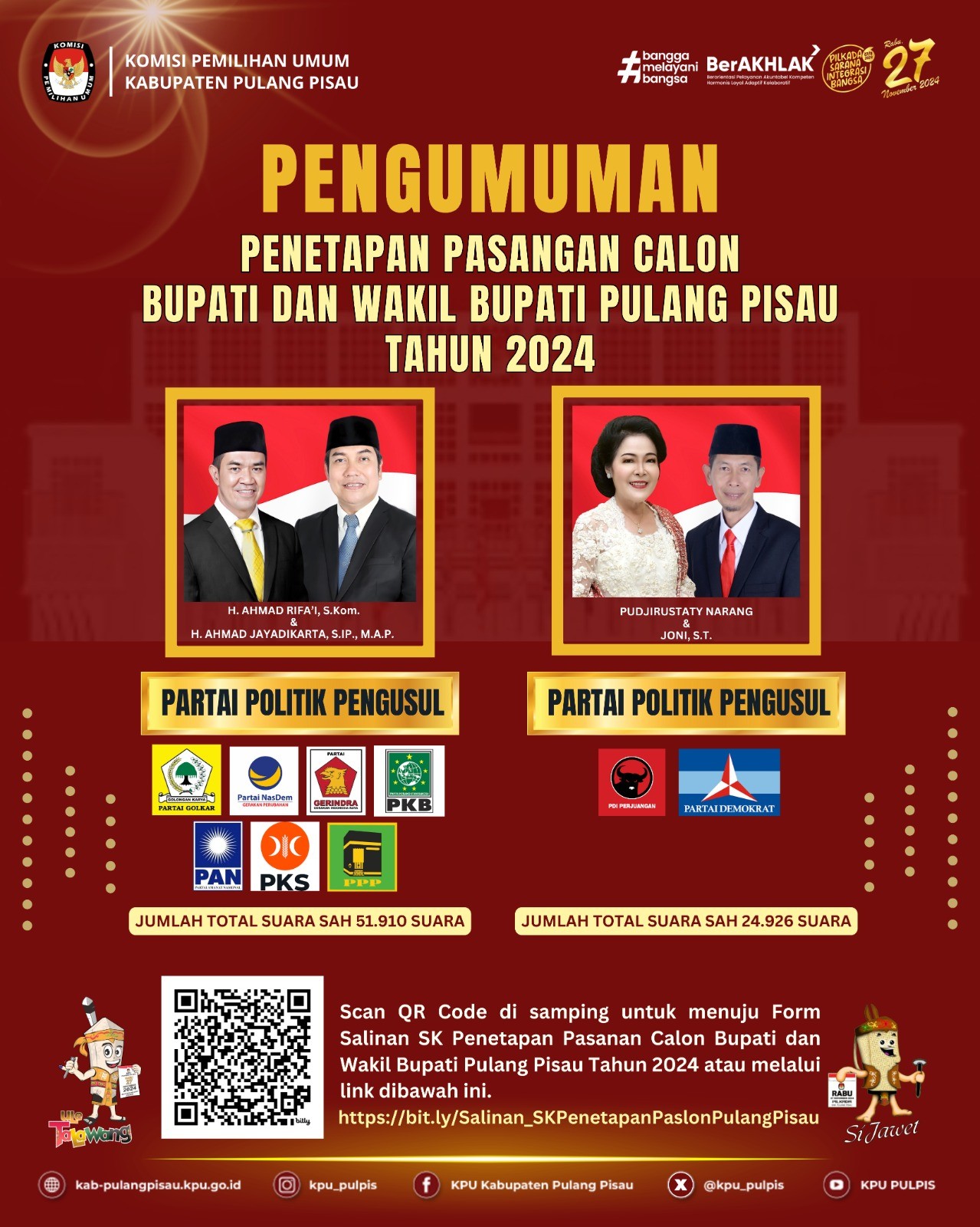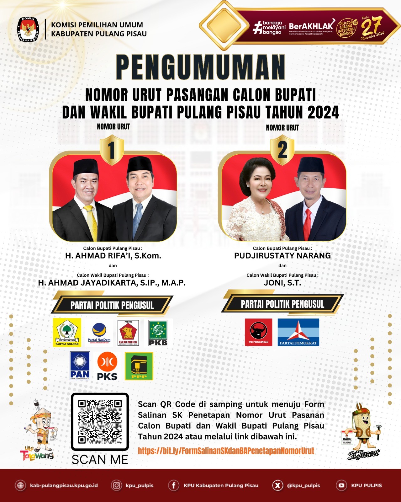 Scan QR Code di postingan ini untuk unduh Form Salinan SK Penetapan Nomor Urut Pasangan Calon Bupati dan Wakil Bupati Pulang Pisau Tahun 2024 atau Pengumuman bisa didapat melalui Link disini