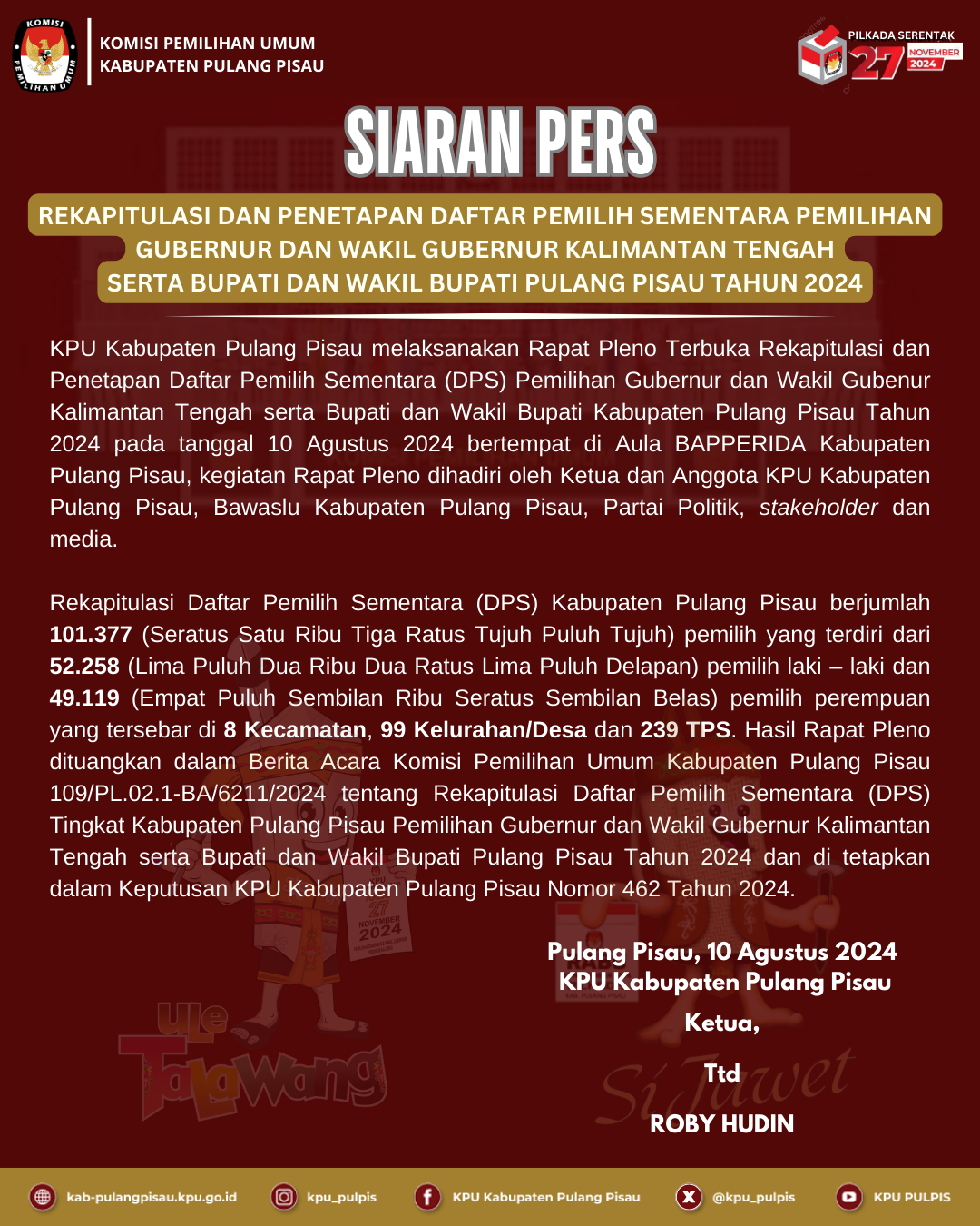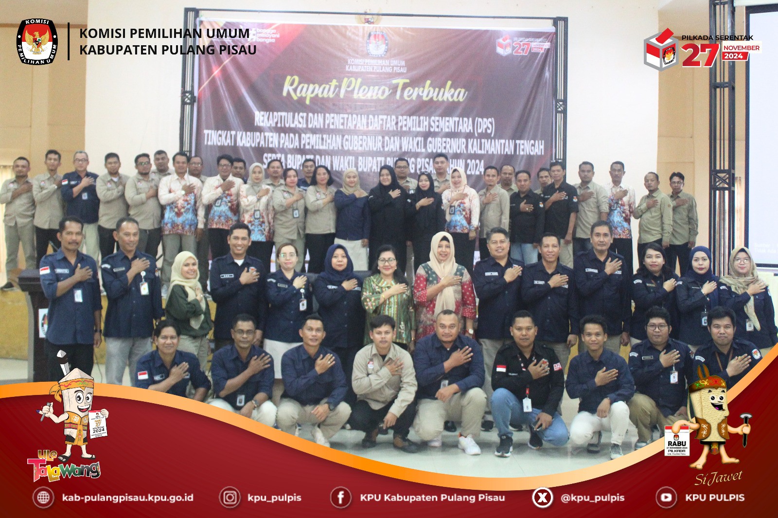 KPU Kabupaten Pulang Pisau gelar Rapat Pleno Terbuka Rekapitulasi dan Penetapan Daftar Pemilih Sementara (DPS) tingkat Kabupaten pada Pemilihan Gubernur dan Wakil Gubernur Kalimantan Tengah serta Bupati dan Wakil Bupati Pulang Pisau Tahun 2024, Sabtu (10/08/2024).