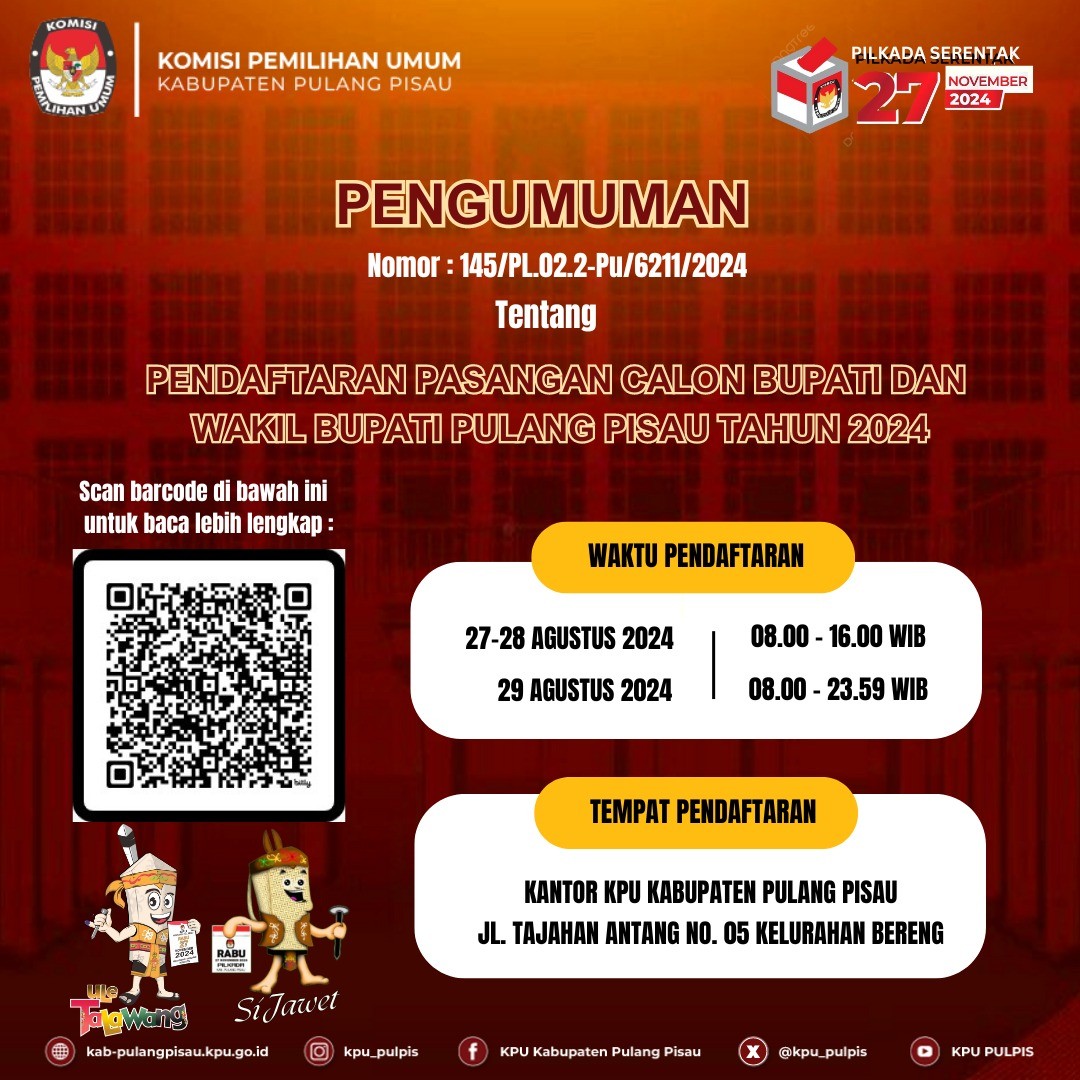 Rekapitulasi Rapat Pleno Terbuka DPS Kabupaten Pulang Pisau menetapkan Jumlah Pemilih DPS sebanyak 101.377 terdiri dari 52.258 laki-laki dan 49.199 perempuan, jumlah TPS 239 yang tersebar di 8 (delapan) Kecamatan dan 99 (sembilan puluh sembilan) Desa/Kelurahan.